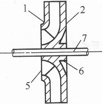 1一前蓋板;2一后蓋板;3一葉片;4葉槽;    1一吸人口;2一輪蓋;3一葉片5一吸水口;6一輪轂;7一泵軸    4一輪轂;5一軸孔